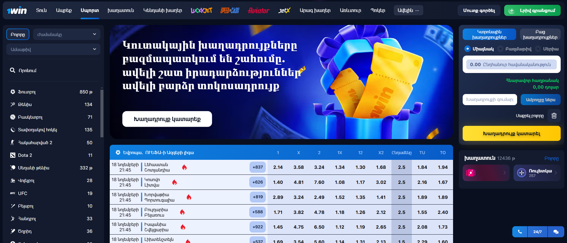 Հայաստանում 1win կատեգորիայի երաշխավորված մուտքն առաջարկվում է գրանցված բոլոր մասնակիցներին: Այս բաժնում ներկայացված են ավելի քան 30 սպորտաձևեր, այդ թվում՝ ֆուտբոլ, բռնցքամարտ, վոլեյբոլ և բասկետբոլ: Շատերն ուշադրություն են դարձնում առցանց խաղերի վրա խաղադրույք կատարելու հնարավորությանը։ eSports բաժինը ներառում է այնպիսի ոլորտներ, ինչպիսիք են Counter Strike-ը, WoW-ը և Dota 2-ը: Միայն գրանցումից հետո դուք հնարավորություն ունեք խաղադրույք կատարել սպորտի վրա: Դա անելու համար ձեզ հարկավոր է.
